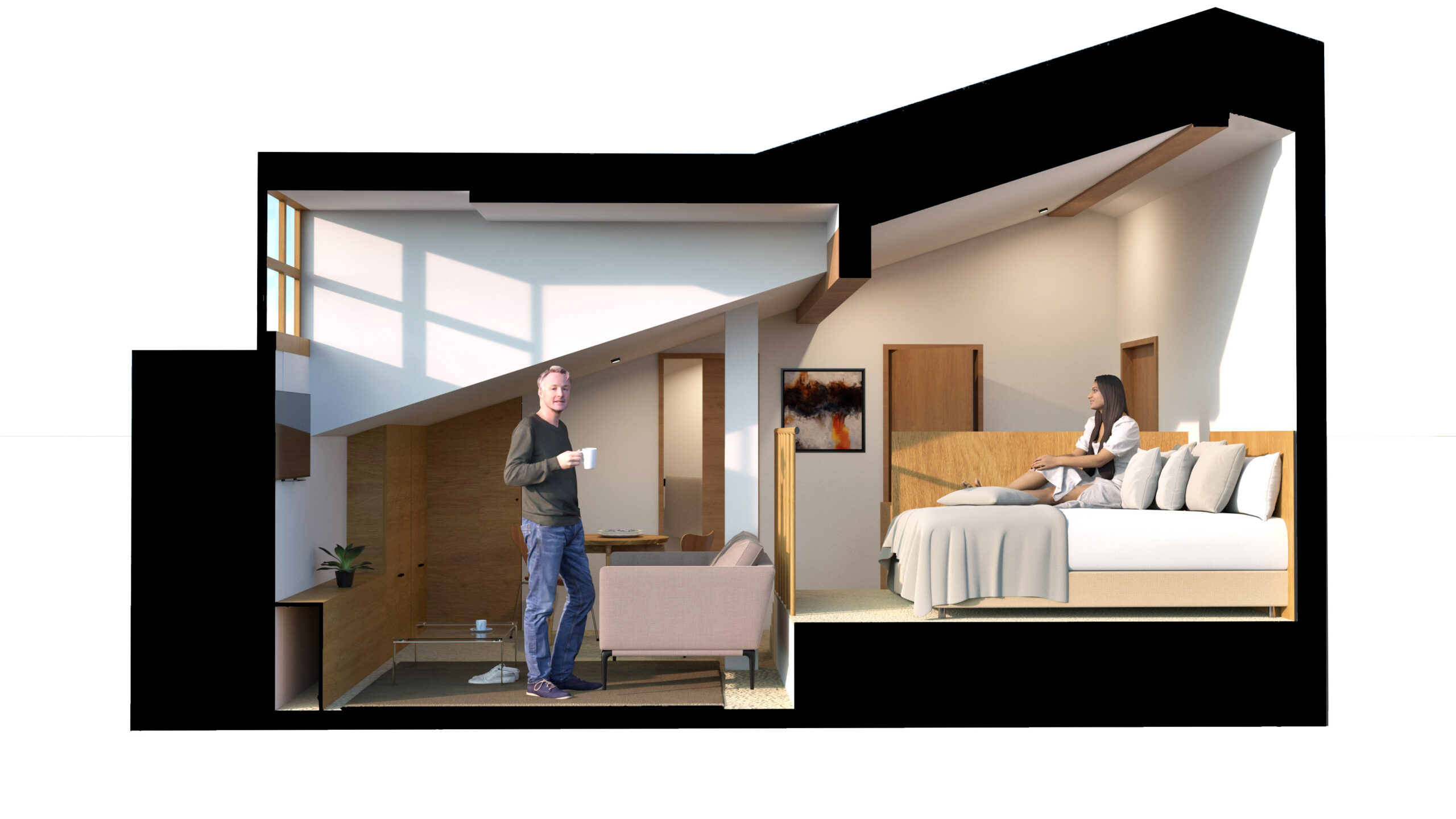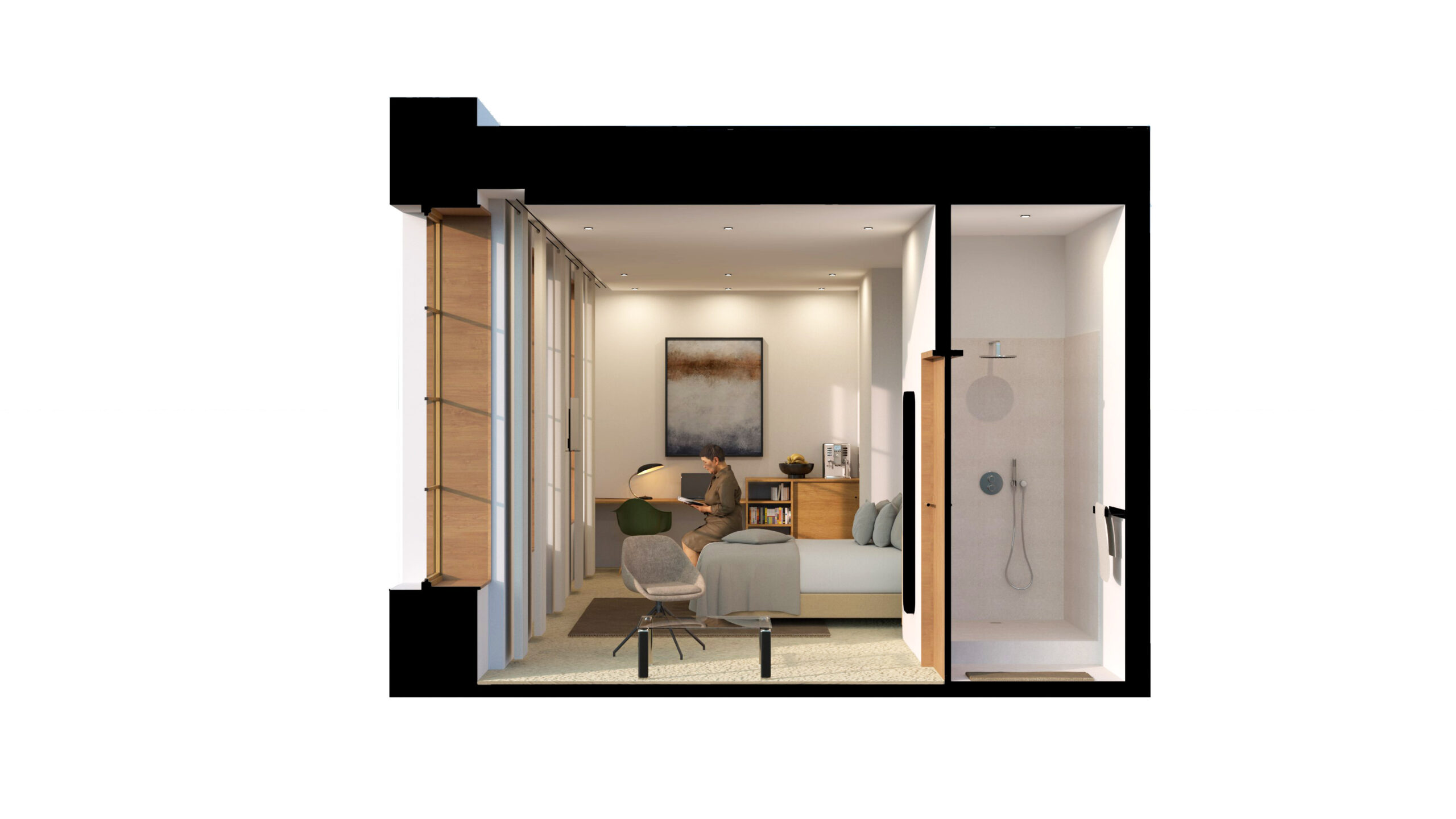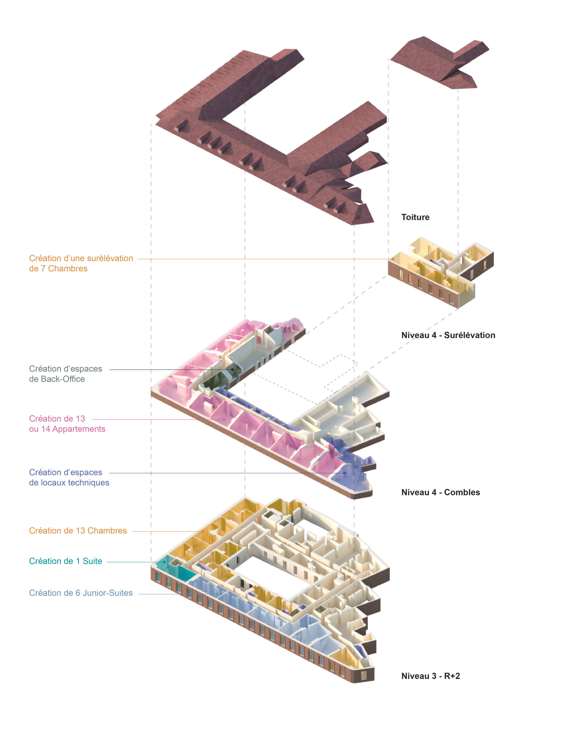 L’ensemble des chambres fait l’objet d’une reconfiguration complète. Dans les combles, les nouvelles unités sont conçues avec des plateformes de couchage surélevées, permettant une contemplation directe du ciel depuis le lit, accentuant ainsi la dimension immersive de l’espace nuit. Les niveaux inférieurs sont quant à eux caractérisés par de larges baies vitrées, cadrant des vues ouvertes sur la place du Capitole ainsi que sur les toitures en tuiles canal, typiques de l’architecture régionale. Cette approche privilégie la relation au paysage urbain et au ciel, tout en affirmant une lecture sensible de l’existant.